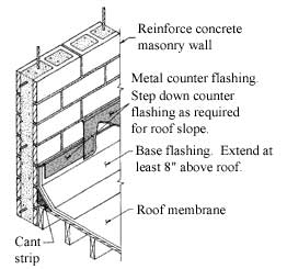 Roof Flashing Connections to Concrete Masonry Walls. Counter flashing and base flashing are vital in resisting water penetration between roof structures and concrete masonry walls (see Figure 4). Consideration should be given so the wall strength is not adversely affected by extending the flashing too deeply into the mortar joints.